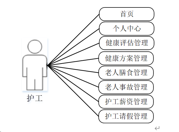 护工:护工进入系统可以对首页、个人中心、健康评估管理、健康方案管理、老人膳食管理、老人事故管理、护工薪资管理、护工请假管理等功能进行操作。护工用例如图3-5所示。