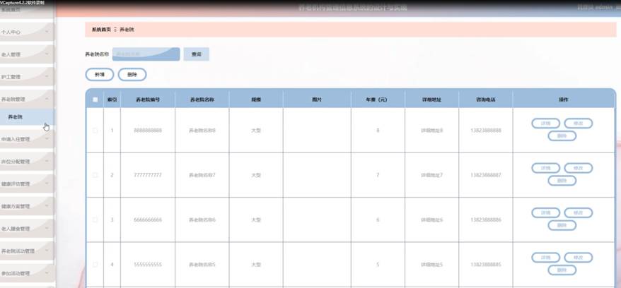 管理员点击养老院管理。在养老院页面输入养老院名称进行查询、新增或删除养老院列表,并根据需要对养老院详情信息进行详情、修改或删除操作。如图5-8所示:
