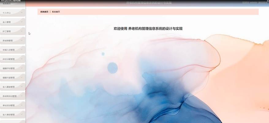 管理员进入主界面,主要功能包括首页、个人中心、老人管理、护工管理、养老院管理、申请入住管理、床位分配管理、健康评估管理、健康方案管理、老人膳食管理、养老院活动管理、参加活动管理、老人事故管理、老人请假管理、护工薪资管理、护工请假管理、系统管理等功能。管理员主界面如图5-5所示: