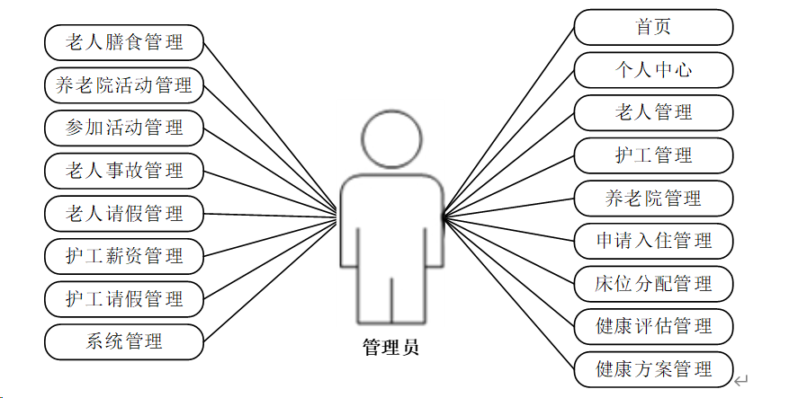 管理员模块:管理员是系统中的核心用户,管理员登录后,可以对系统进行管理。主要功能有首页、个人中心、老人管理、护工管理、养老院管理、申请入住管理、床位分配管理、健康评估管理、健康方案管理、老人膳食管理、养老院活动管理、参加活动管理、老人事故管理、老人请假管理、护工薪资管理、护工请假管理、系统管理等功能。管理员用例如图3-3所示。