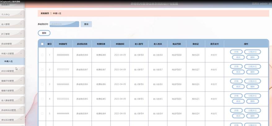 管理员点击申请入住管理。在申请入住页面输入养老院名称进行查询或删除申请入住列表,并根据需要对申请入住详情信息进行详情、修改、分配床位或删除操作;如图5-9所示: