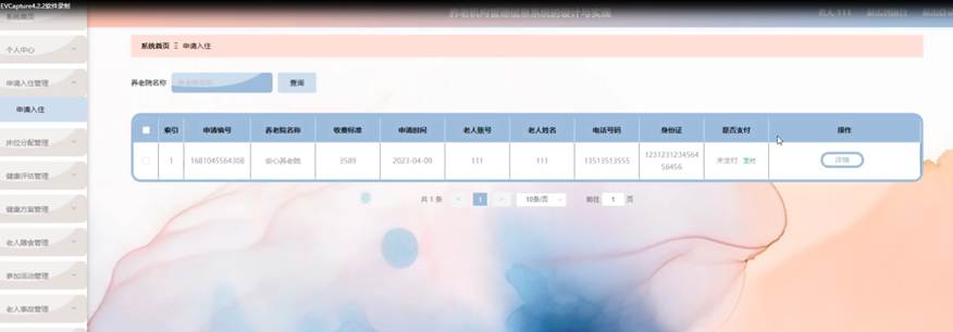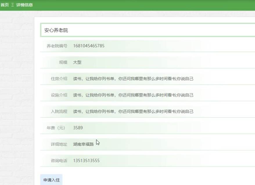 老人点击申请入住管理。在申请入住页面输入养老院名称进行查询申请入住列表,并根据需要对申请入住详情信息进行详情操作;如图5-11所示: