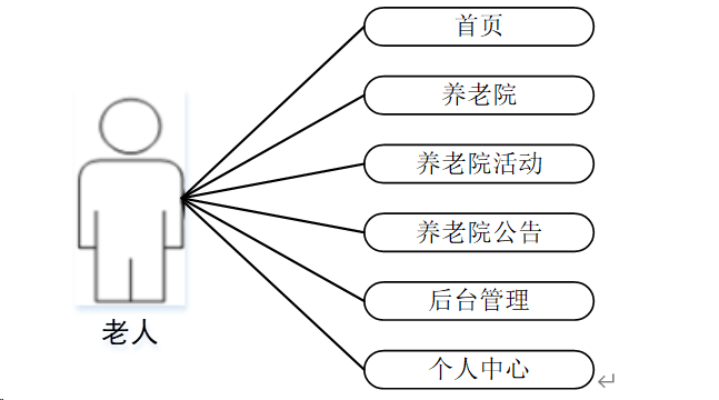 老人:老人进入系统可以对首页、养老院、养老院活动、养老院公告、后台管理、个人中心等功能进行操作。老人用例如图3-4所示。