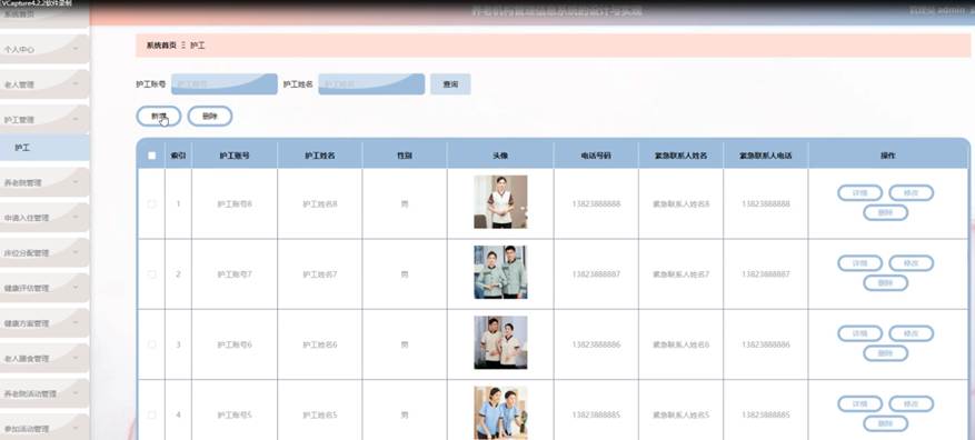 管理员点击护工管理。在护工页面输入护工账号、护工姓名进行查询、新增或删除护工列表,并根据需要对护工详情信息进行详情、修改或删除操作。如图5-7所示: