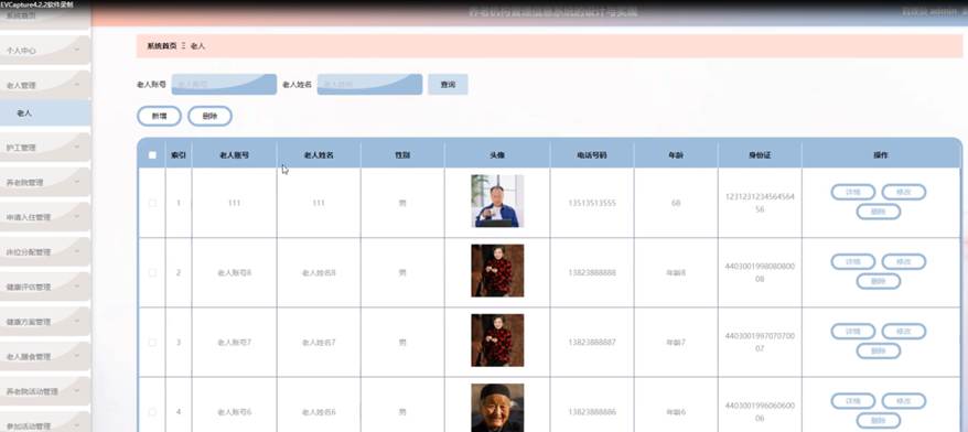 管理员点击老人管理。在老人页面输入老人账号、老人姓名进行查询、新增或删除老人列表,并根据需要对老人详情信息进行查看详情、修改或删除操作。如图5-6所示: