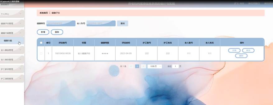 护工点击健康评估管理。在健康评估页面输入健康等级、老人账号进行查询、新增、删除健康评估列表,并根据需要对健康评估详情信息进行详情、修改、删除操作;如图5-13所示:
