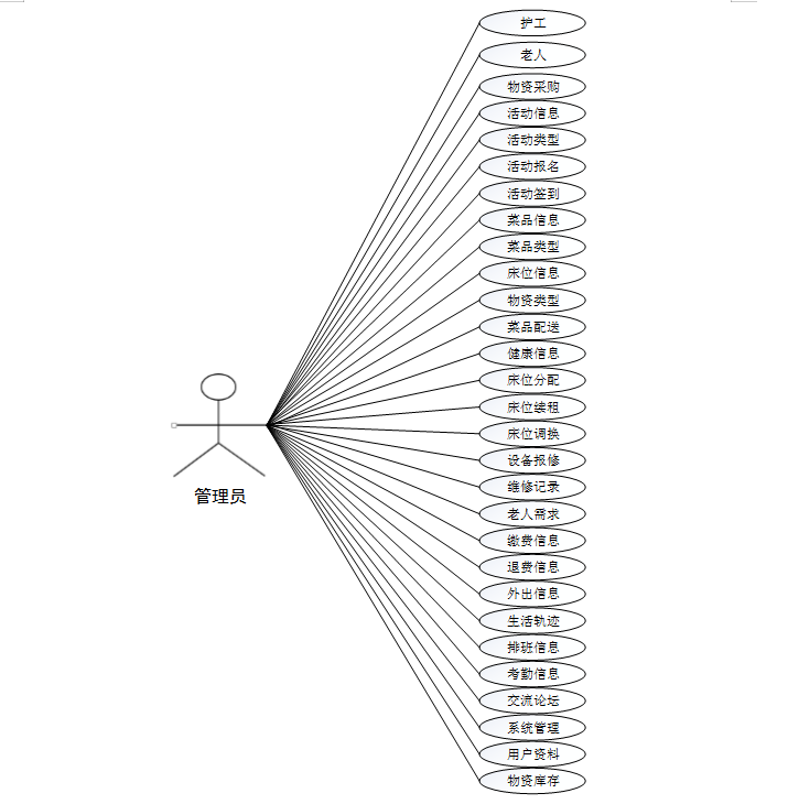 (1)管理员关键功能包含老人、护工、活动信息、活动类型、活动报名、活动签到、菜品信息、菜品类型、菜品配送、物资库存、物资类型、物资采购、床位信息、床位分配、床位调换、床位续租、设备报修、维修记录、健康信息、外出信息、生活轨迹、老人需求、缴费信息、退费信息、排班信息、考勤信息、交流论坛、系统管理、用户资料等进行管理。管理员用例如下: