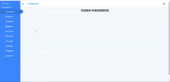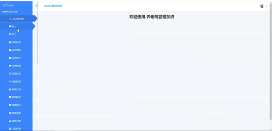 管理员进入主页面,主要功能包括对老人、护工、活动信息、活动类型、活动报名、活动签到、菜品信息、菜品类型、菜品配送、物资库存、物资类型、物资采购、床位信息、床位分配、床位调换、床位续租、设备报修、维修记录、健康信息、外出信息、生活轨迹、老人需求、缴费信息、退费信息、排班信息、考勤信息、交流论坛、系统管理、用户资料等进行操作。管理员主页面如图5-6所示: