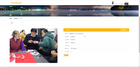 活动信息:在活动信息页面的输入栏中输入活动名称、活动地点进行查询,可以查看到活动详细信息,并根据需要进行活动报名或收藏操作;活动信息页面如图5-3所示:
