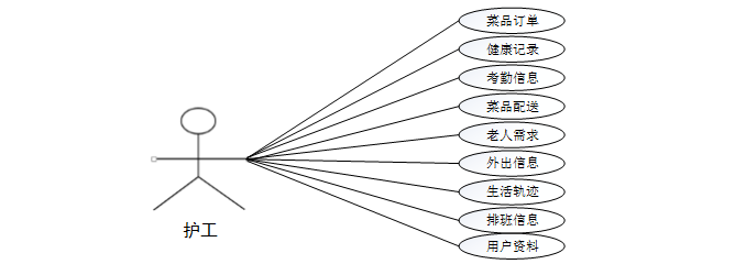 (2)护工关键功能包含菜品订单、菜品配送、健康记录、外出信息、生活轨迹、老人需求、排班信息、考勤信息、用户资料等进行管理。护工用例如下: