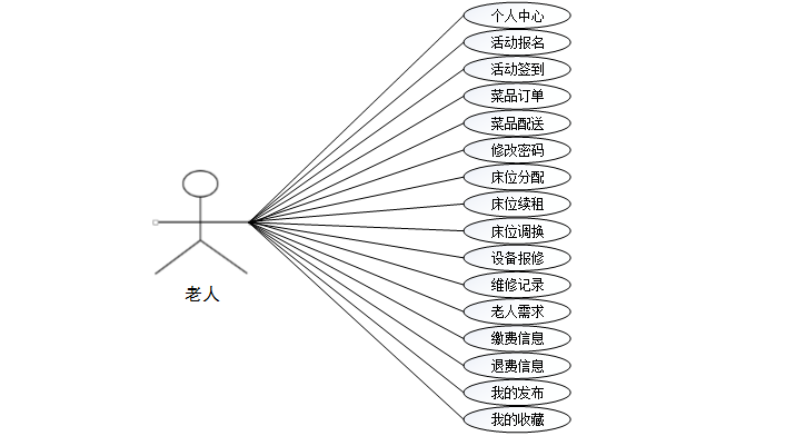 (3)老人关键功能包含个人中心、修改密码、活动报名、活动签到、菜品订单、菜品配送、床位分配、床位调换、床位续租、设备报修、维修记录、老人需求、缴费信息、退费信息、我的发布、我的收藏等进行管理。老人用例如下: