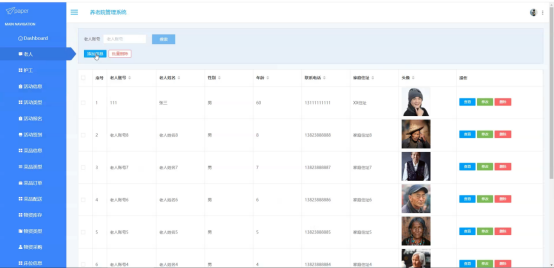 老人档案:账号、姓名、性别、年龄、电话、家庭住址、头像。