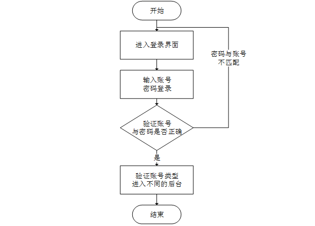 登录流程是该系统的第一个流程,登录的第一步是输入账号、密码登录,系统会验证账号与密码是否正确,正确时系统会判断账号类型再进入不同的后台;不正确时,会返回到登录的第一步,输入用户重新执行登录流程。该流程如图3-4所示。