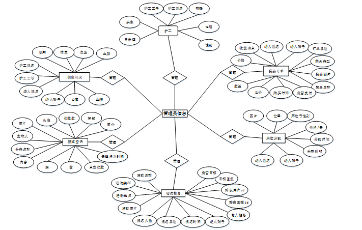 E-R图即实体-联系图,主要作用是提供了解显示数据类型存在的联系的途径,是藐视现实世界的概念模型,其关键要素是实体型、属性、联系。在系统中将对“护工、活动报名、健康记录、床位分配、菜品订单、新闻资讯”等作为实体,它们的局部E-R图,如图4-2所示: