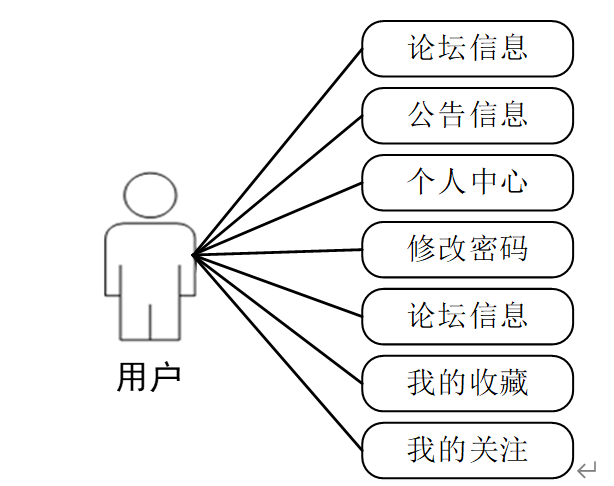 用户:用户登录进入系统可以实现对首页、修改密码、论坛信息、我的收藏、我的关注等进行操作。用户用例如图3-2所示。