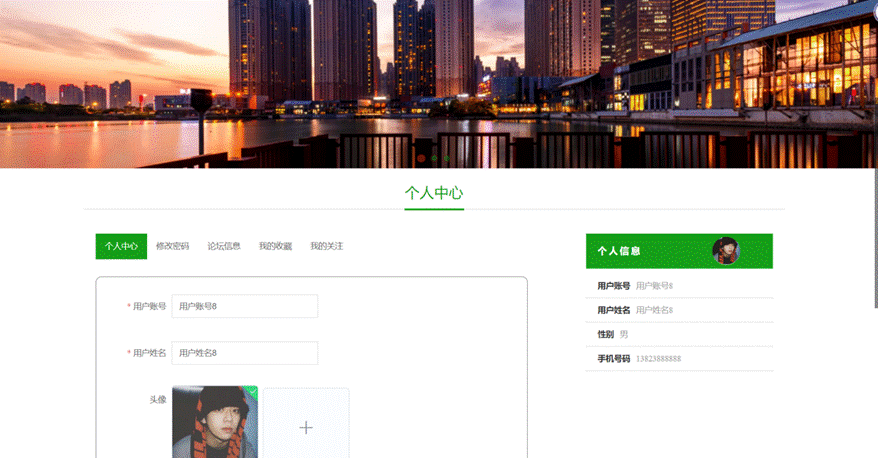 个人中心:在个人中心页面可以对修改密码、论坛信息、我的收藏、我的关注进行详细操作;如图5-4所示: