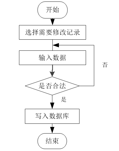 管理员可以修改信息,用户可以修改自己权限内的信息,首先进入修改信息界面,输入需要修改信息,在系统进行判定为正确和合规后修改成功,并将数据更新至数据库。信息不合法则修改失败,重新输入。修改信息流程图如图3-7所示。
