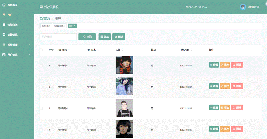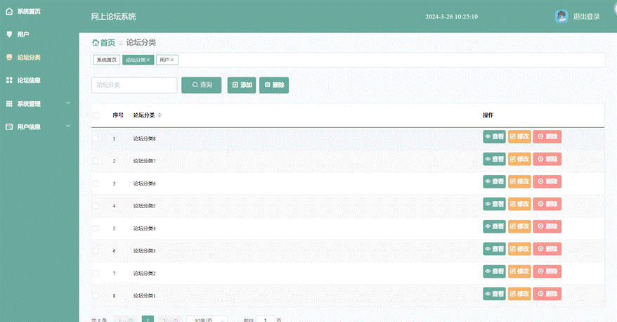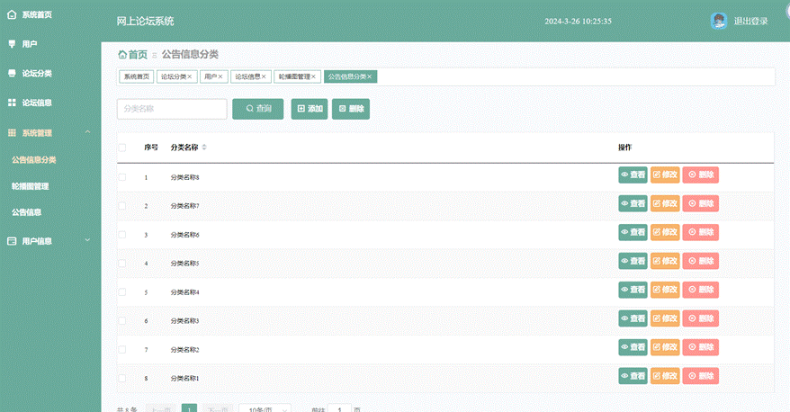 论坛分类功能在视图层(view层)进行交互,比如点击“查询、添加或删除”按钮或填写论坛分类信息表单。这些论坛分类信息表单动作被视图层捕获并作为请求发送给相应的控制器层(controller层)。控制器接收到这些请求后,调用服务层(service层)以执行相关的业务逻辑,例如验证输入数据的有效性和与数据库的交互。服务层处理完这些逻辑后,进一步与数据访问对象层(DAO层)交互,后者负责具体的数据操作如查看、修改或删除论坛分类信息,并将操作结果返回给控制器。最终,控制器根据这些结果更新视图层,以便论坛分类功能可以看到最新的信息或相应的操作反馈。论坛分类界面如图5-8所示。