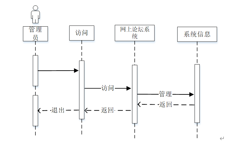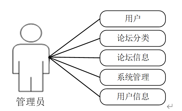 管理员模块:管理员是系统中的核心用户,管理员登录后,可以对后台系统进行管理。主要功能有用户、论坛分类、论坛信息、系统管理、用户信息等功能。管理员用例如图3-1所示。