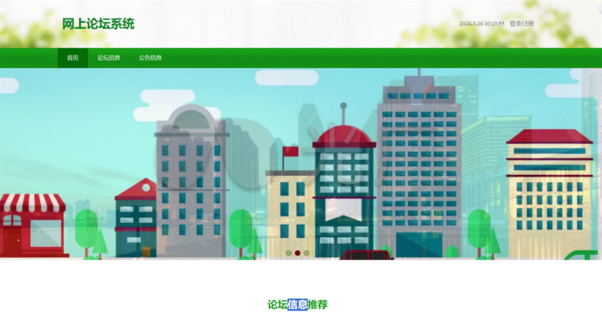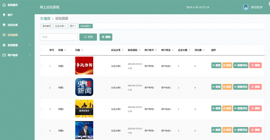 论坛信息功能在视图层(view层)进行交互,比如点击“查询或删除”按钮或填写论坛信息表单。这些论坛信息表单动作被视图层捕获并作为请求发送给相应的控制器层(controller层)。控制器接收到这些请求后,调用服务层(service层)以执行相关的业务逻辑,例如验证输入数据的有效性和与数据库的交互。服务层处理完这些逻辑后,进一步与数据访问对象层(DAO层)交互,后者负责具体的数据操作如查看、修改、查看评论或删除论坛信息,并将操作结果返回给控制器。最终,控制器根据这些结果更新视图层,以便论坛信息管理功能可以看到最新的信息或相应的操作反馈。论坛信息界面如图5-9所示。