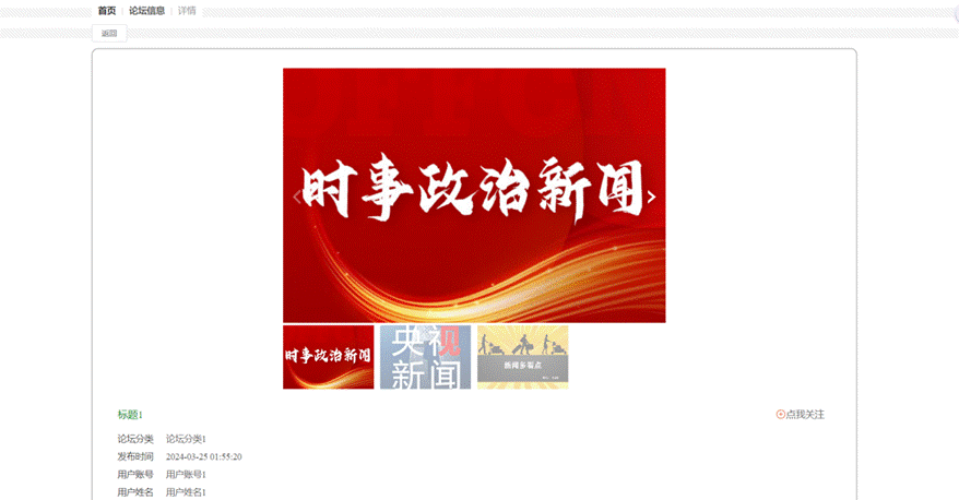 论坛信息:在论坛信息页面的输入栏中输入标题进行查询,可以查看到课论坛详细信息,并进行关注操作;论坛信息页面如图5-3所示: