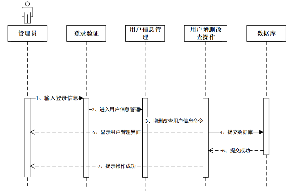 用户功能在视图层(view层)进行交互,比如点击“查询、添加或删除”按钮或填写用户信息表单。这些用户信息表单动作被视图层捕获并作为请求发送给相应的控制器层(controller层)。控制器接收到这些请求后,调用服务层(service层)以执行相关的业务逻辑,例如验证输入数据的有效性和与数据库的交互。服务层处理完这些逻辑后,进一步与数据访问对象层(DAO层)交互,后者负责具体的数据操作如查看、修改或删除用户信息,并将操作结果返回给控制器。最终,控制器根据这些结果更新视图层,以便用户功能可以看到最新的信息或相应的操作反馈。用户管理界面如图5-7所示;