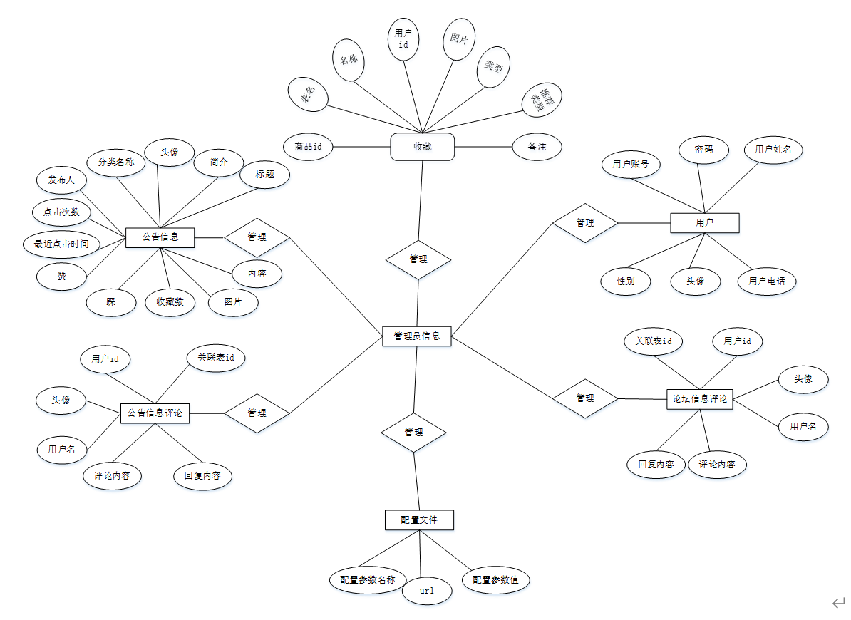 E-R图即实体-联系图,主要作用是提供了解显示数据类型存在的联系的途径,是藐视现实世界的概念模型,其关键要素是实体型、属性、联系。在系统中将对“用户、配置文件、论坛信息评论、公告信息评论、公告信息、收藏”等作为实体,它们的局部E-R图,如图4-3所示: