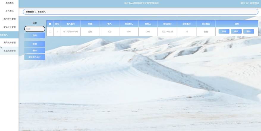 家主点击家主收入管理。在家主收入页面输入标题进行查询、新增、删除或统计家主收入列表,并根据需要对家主收入详细信息进行详情、修改或删除操作。如图5-12所示:
