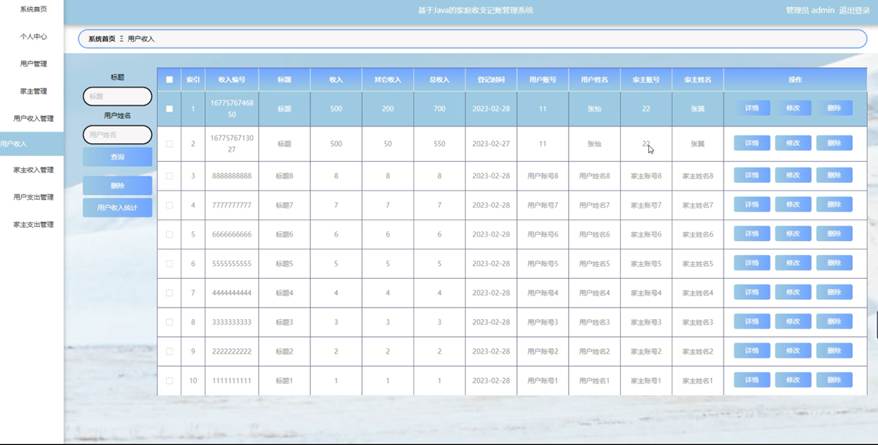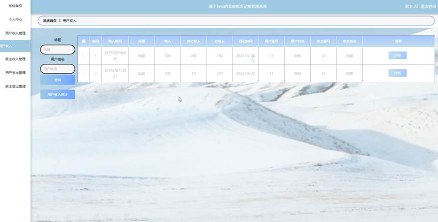 家主点击用户收入管理。在用户收入页面输入标题和用户姓名进行查询或统计用户收入列表,并根据需要对用户收入详细信息进行详情操作。如图5-11所示: