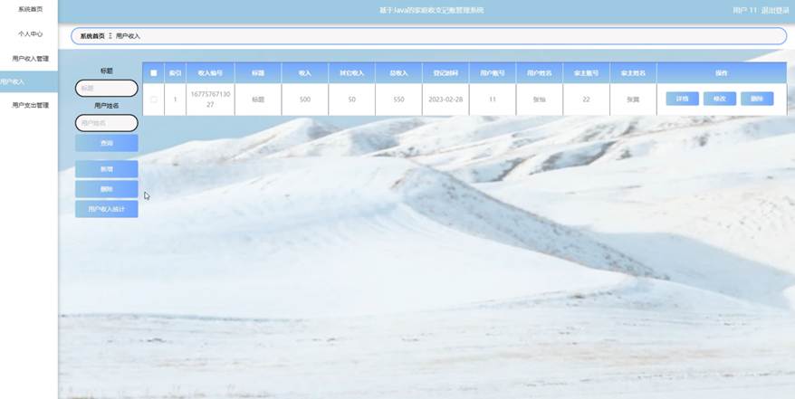 用户点击用户收入管理。在用户收入页面输入标题和用户姓名进行查询、新增、删除或统计用户收入列表,并根据需要对用户收入详细信息进行详情、修改或删除操作。如图5-15所示: