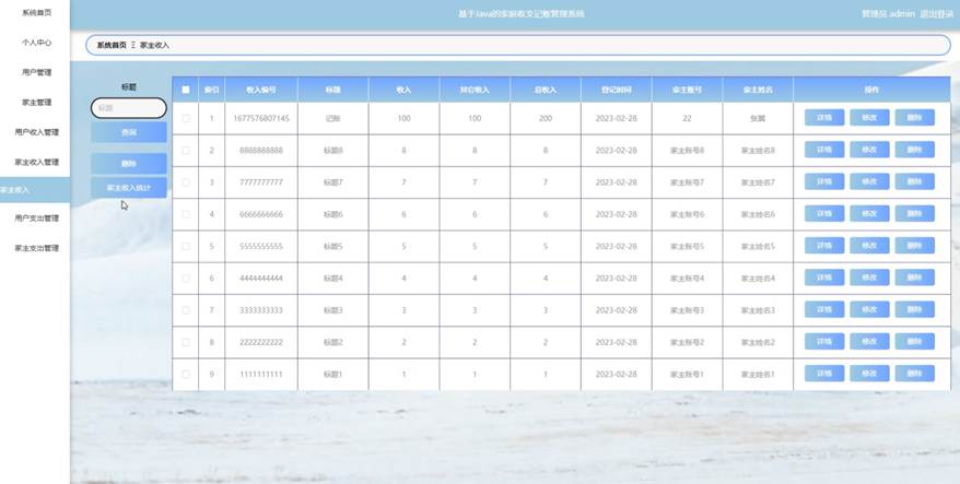管理员点击家主收入管理。在家主收入页面输入标题进行查询、删除或统计家主收入列表,并根据需要对家主收入详细信息进行详情、修改或删除操作。如图5-7所示: