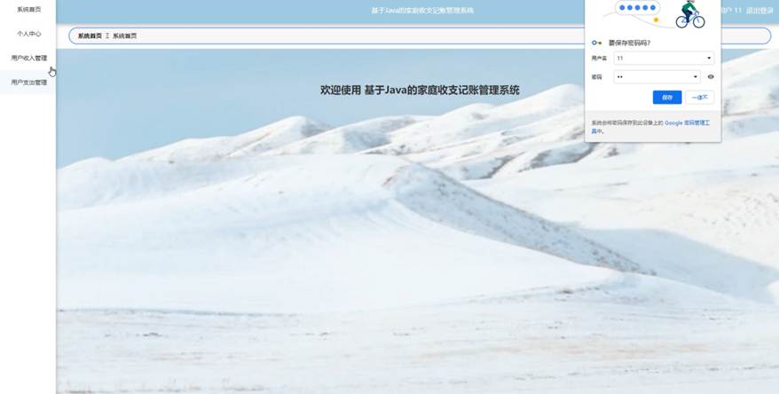 用户进入系统可以对系统首页,个人中心,用户收入管理,用户支出管理等功能进行操作。用户主页面如图5-14所示: