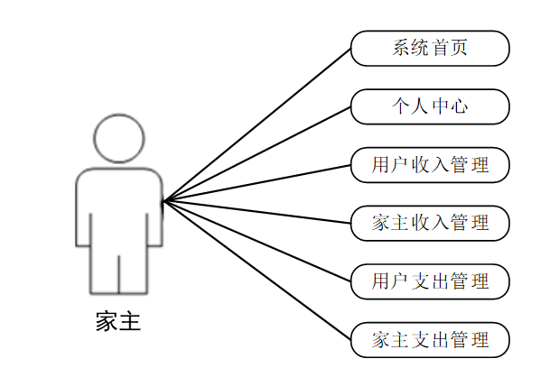 (3) 家主可以对系统首页,个人中心,用户收入管理,家主收入管理,用户支出管理,家主支出管理进行操作,用例分析如图3-3所示。