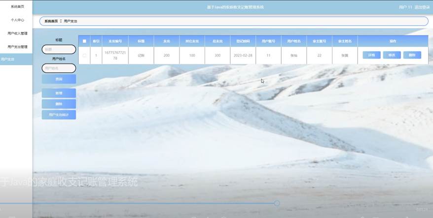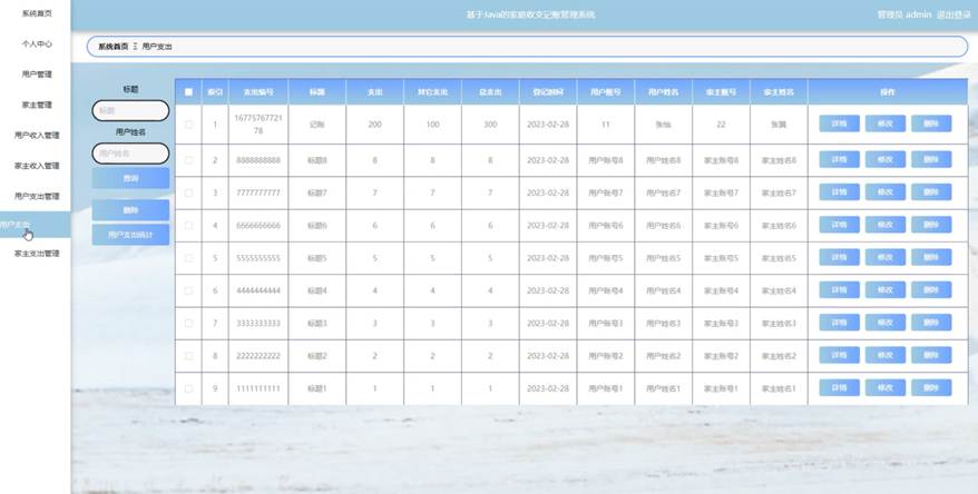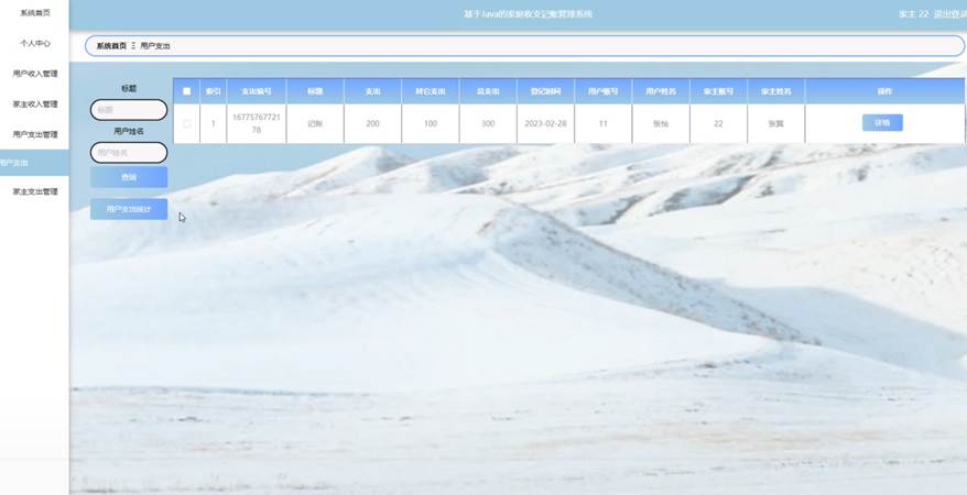 家主点击用户支出管理。在用户支出页面输入标题和用户姓名进行查询或统计用户支出列表,并根据需要对用户支出详细信息进行详情操作。如图5-13所示: