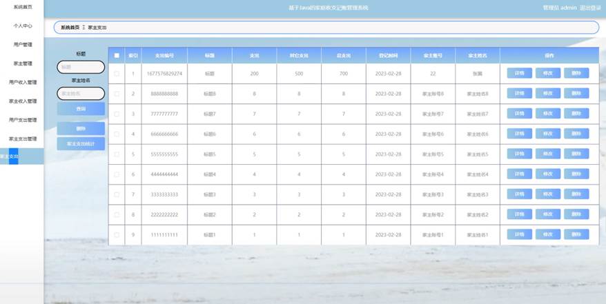 管理员点击家主支出管理。在家主支出页面输入标题和家主姓名进行查询、删除或统计家主支出列表,并根据需要对家主支出详细信息进行详情、修改或删除操作。如图5-9所示: