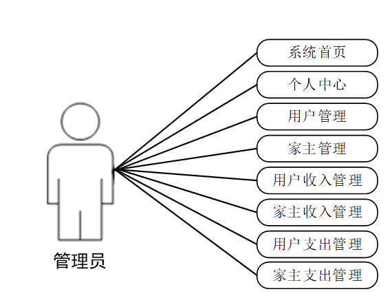 (2)管理员可以对系统首页,个人中心,用户管理,家主管理,用户收入管理,家主收入管理,用户支出管理,家主支出管理等进行基本的信息管理。其用例分析如图3-2所示。