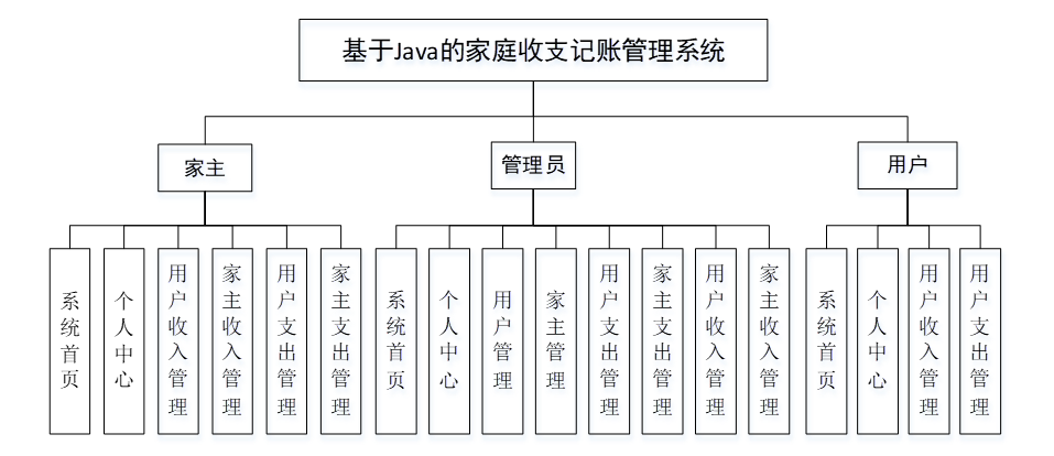 该系统分为管理员、家主、用户三类角色功能,用户端(B/S 端)包含注册登录模块,支持凭账号(绑定姓名、性别、手机号码、头像、关联家主账号)注册与安全登录;个人中心模块,更新个人信息(密码、联系方式、头像);用户收入管理模块,记录个人收入(标题、收入金额、其他收入、总收入、登记时间、收入明细),查看个人收入列表;用户支出管理模块,记录个人支出(标题、支出金额、其他支出、总支出、登记时间、支出明细),查看个人支出列表。家主端包含个人中心,维护家主信息(姓名、性别、手机号码、头像);用户收入管理模块,查看关联用户的收入记录(标题、总收入、登记时间);家主收入管理模块,记录家庭公共收入(标题、收入金额、其他收入、总收入、登记时间、收入明细);用户支出管理模块,查看关联用户的支出记录(标题、总支出、登记时间);家主支出管理模块,记录家庭公共支出(标题、支出金额、其他支出、总支出、登记时间、支出明细)。管理员端包含系统首页、个人中心,维护管理员信息;用户管理模块,查询、新增、修改用户账号(姓名、手机号码、关联家主账号、头像);家主管理模块,查询、新增、修改家主账号(姓名、手机号码、头像);用户收入管理模块,查看所有用户收入记录(标题、总收入、用户信息、家主信息),统计收入数据;家主收入管理模块,查看所有家主收入记录(标题、总收入、登记时间);用户支出管理模块,查看所有用户支出记录(标题、总支出、用户信息、家主信息),统计支出数据;家主支出管理模块,查看所有家主支出记录(标题、总支出、登记时间)。系统通过收入表、支出表、用户表等数据库表实现数据存储,覆盖从个人收支记录到家庭财务统计的全流程,满足家庭收支记账管理系统信息化需求。