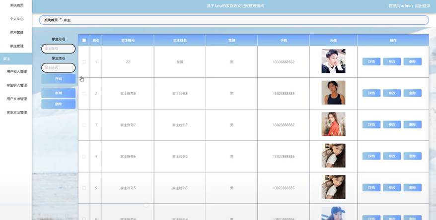 管理员点击家主管理。进入家主页面输入家主账号和家主姓名进行查询、新增或删除家主列表,并根据需要对家主详细信息进行详情、修改或删除操作。如图5-5所示: