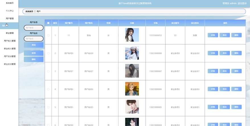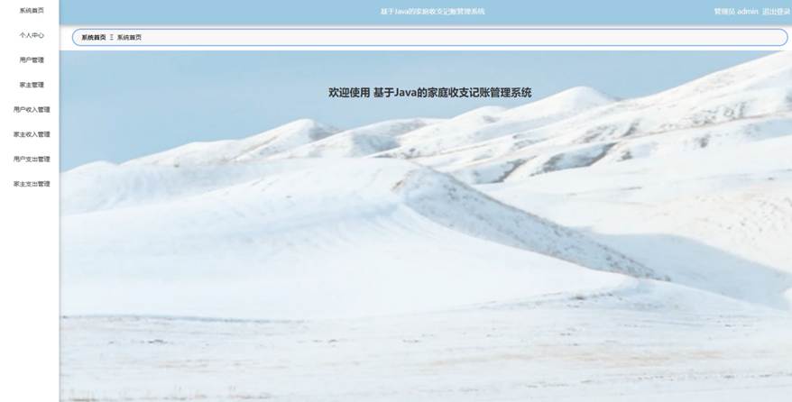管理员进入主页面,主要功能包括对系统首页,个人中心,用户管理,家主管理,用户收入管理,家主收入管理,用户支出管理,家主支出管理等进行操作。管理员主页面如图5-3所示: