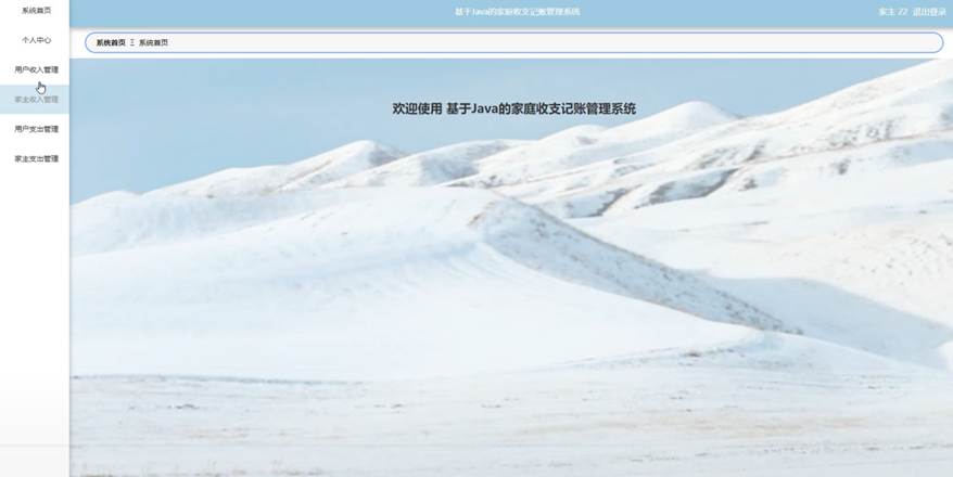 家主进入系统可以对系统首页,个人中心,用户收入管理,家主收入管理,用户支出管理,家主支出管理等功能进行操作。家主主页面如图5-10所示: