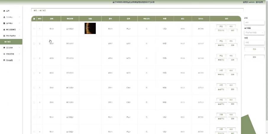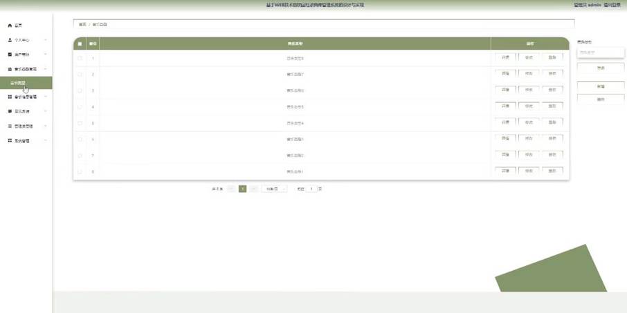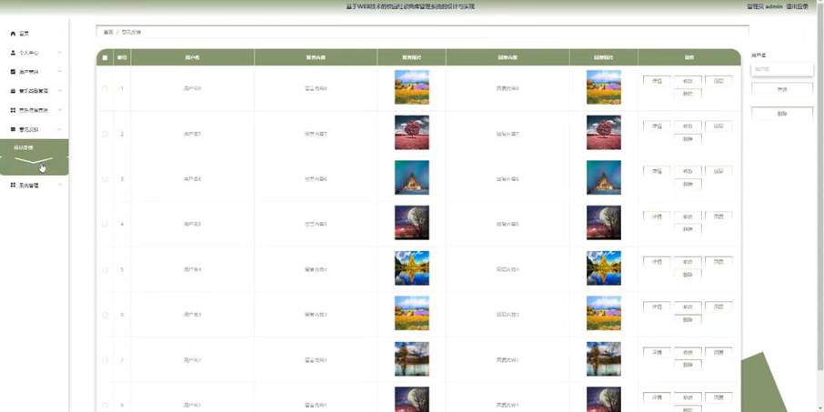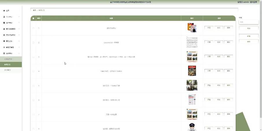 管理员点击系统管理。在新闻公告页面输入标题进行查询、新增或删除新闻公告列表,并根据需要对新闻公告详细信息进行详情、修改或删除操作,还可以对轮播图管理、关于我们进行详细操作,如图5-12所示: