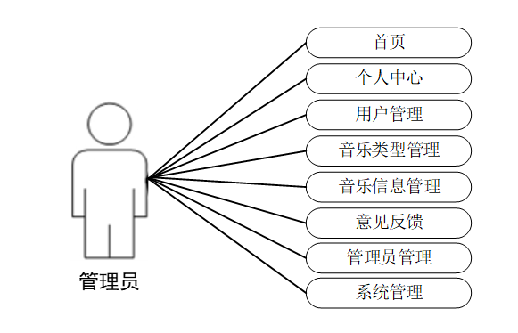 校园红歌曲库管理系统的最大权限用户是管理员,通过管理员菜单中的首页、个人中心、用户管理、音乐类型管理、音乐信息管理、意见反馈、管理员管理、系统管理等选项来对系统后台信息进行管理。管理员用例如图3-6所示。