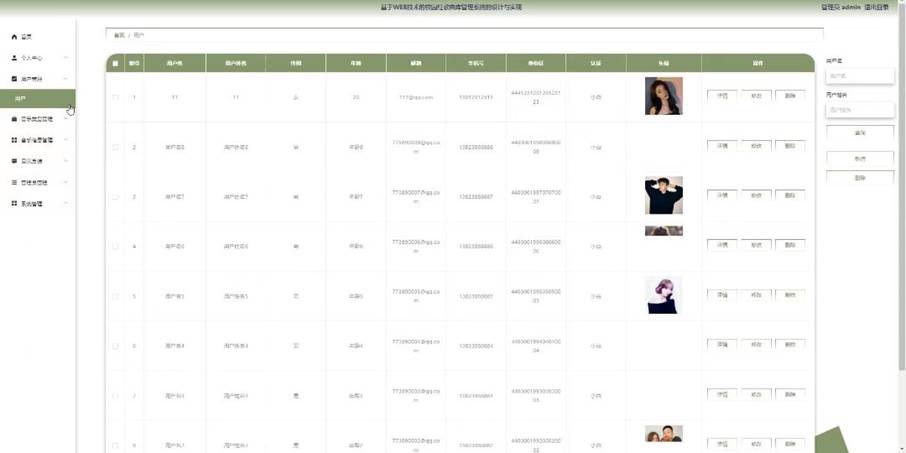 管理员点击用户管理。在用户页面输入用户名和用户姓名进行查询、新增或删除用户列表,并根据需要对用户详情信息进行详情、修改或删除操作,如图5-7所示:
