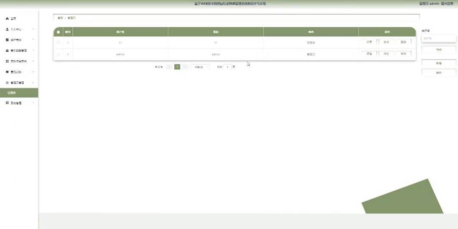 管理员点击管理员管理。在管理员页面输入用户名进行查询、新增或删除管理员列表,并根据需要对管理员详细信息进行详情、修改或删除操作,如图5-11所示: