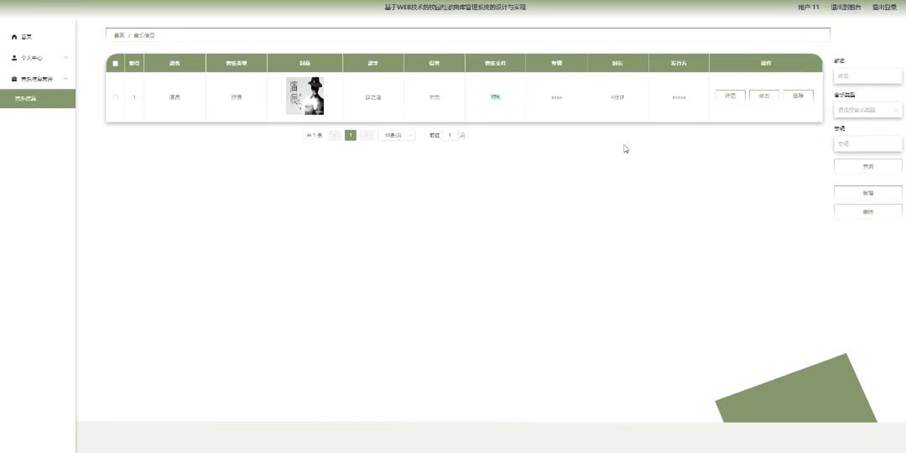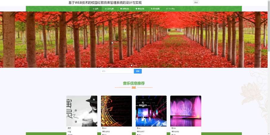 - 音乐信息管理:录入红歌详情(歌名、类型、封面、歌手、语言、音乐文件、专辑、时长、发行方、歌曲详情),支持按歌名、类型、专辑筛选查询,用户可查看详情、收藏或评论;