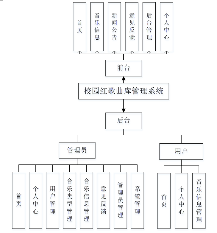 校园红歌曲库管理系统的整体结构设计主要分为两大部分:管理员和用户。管理员的职责是管理用户信息及设置用户权限,发布公告等其他基础功能的管理;用户负责音乐信息管理;整体结构设计如图4-2所示。
