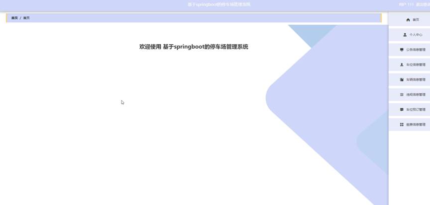 用户进入系统可以对个人中心、公告信息管理、车位信息管理、车辆信息管理、违规信息管理、车位预订管理、缴费信息管理等功能进行操作。用户主页面如图5-10所示: