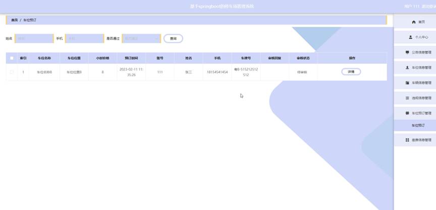 用户点击车位预订管理。在车位预订页面输入姓名、手机、是否通过进行查询车位预订列表,并根据需要对车位预订详情信息进行详情操作;如图5-15所示: