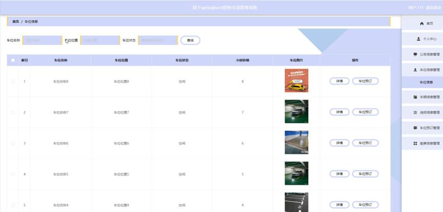 用户点击车位信息管理。在车位信息页面输入车位名称、车位位置和选择车位状态进行查询车位信息列表,并根据需要对车位详情信息进行详情或车位预订操作;如图5-12所示: