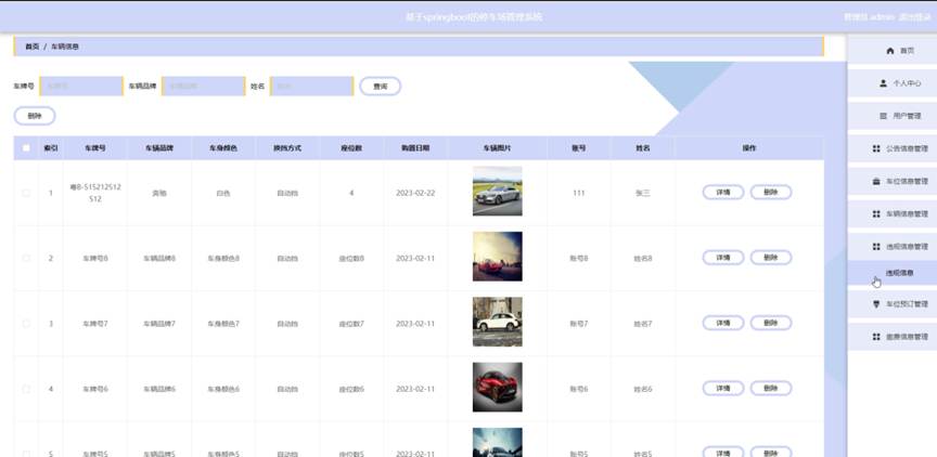 管理员点击车辆信息管理。在车辆信息页面输入车牌号、车辆品牌、姓名进行查询或删除车辆信息列表,并根据需要对车辆详情信息进行详情或删除操作;如图5-6所示: